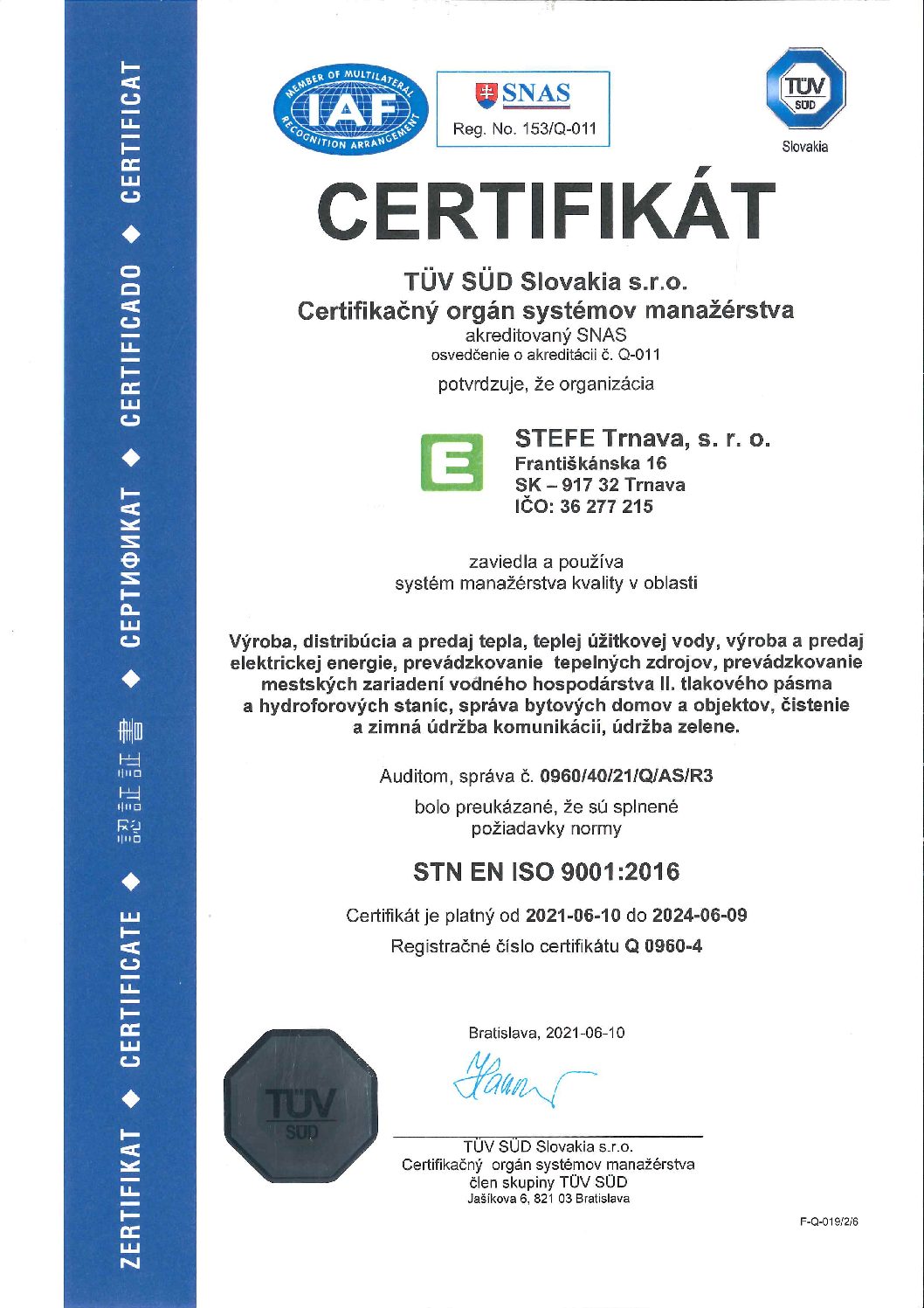 Spoločnosť STEFE Trnava, s.r.o. v júni 2021 obhájila certifikát systému manažérstva kvality podľa STN EN ISO 9001:2016.